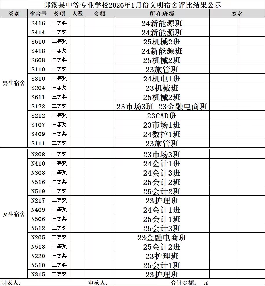 近日,郎溪中专总务处组织开展 2026 年1月份文明宿舍评比活动。活动以精细化管理为核心,围绕整理、安全、素养等标准,总务处工作人员深入 2 栋学生公寓全面检查,重点检查评比地面卫生、床铺整理、收纳摆放、卫生间环境等情况。