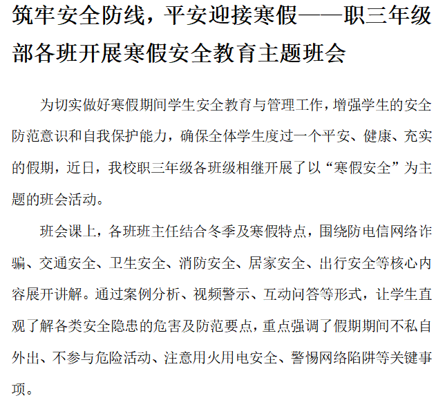筑牢安全防线,平安迎接寒假——职三年级部各班开展寒假安全教育主题班会