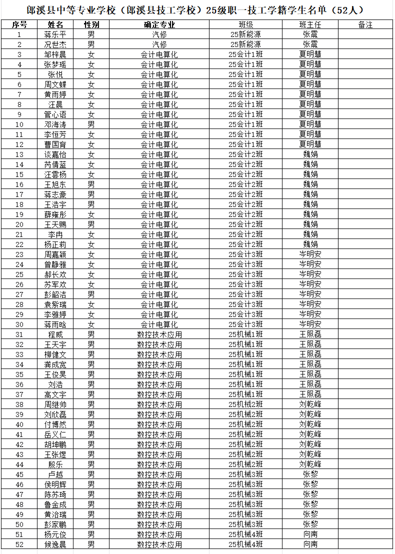 郎溪县中等专业学校(郎溪县技工学校)25级职一技工学籍学生名单