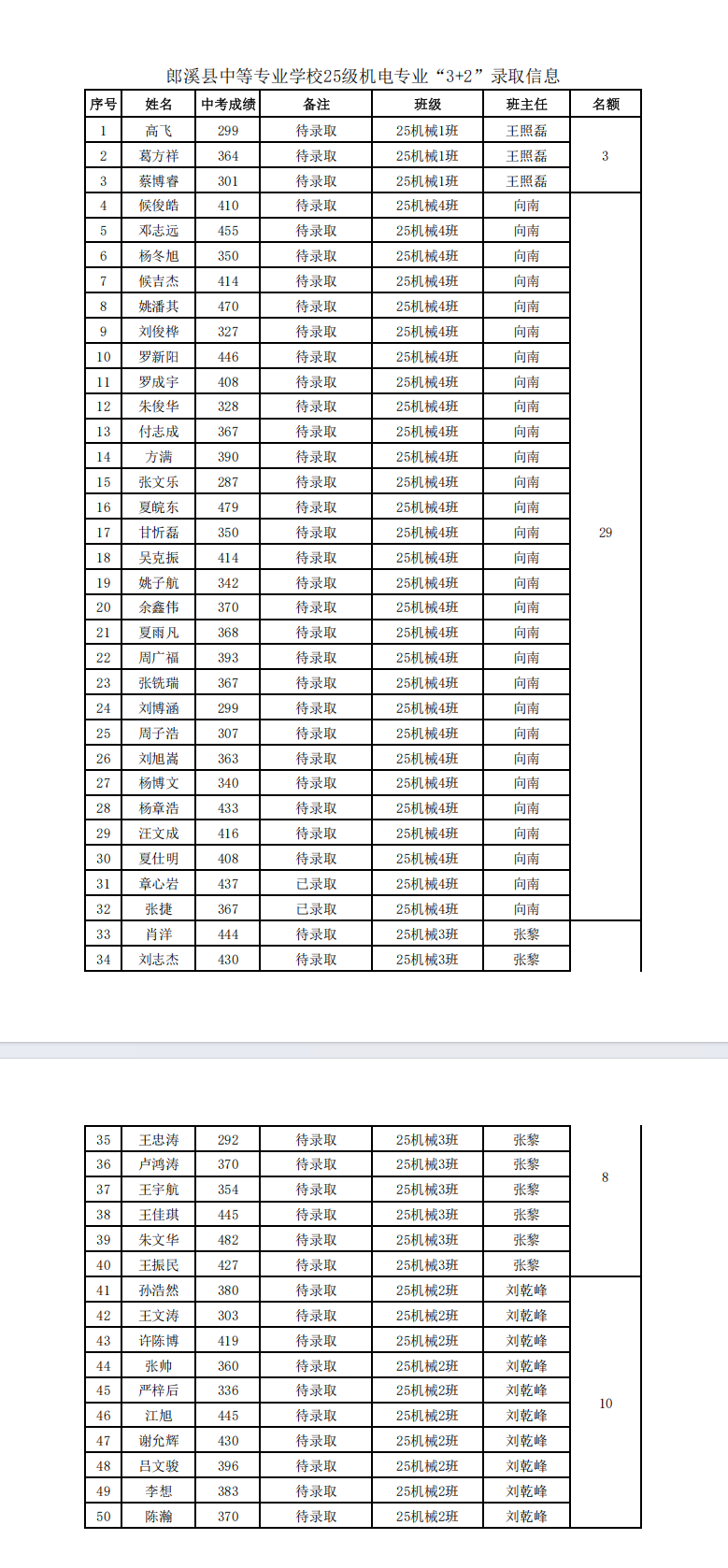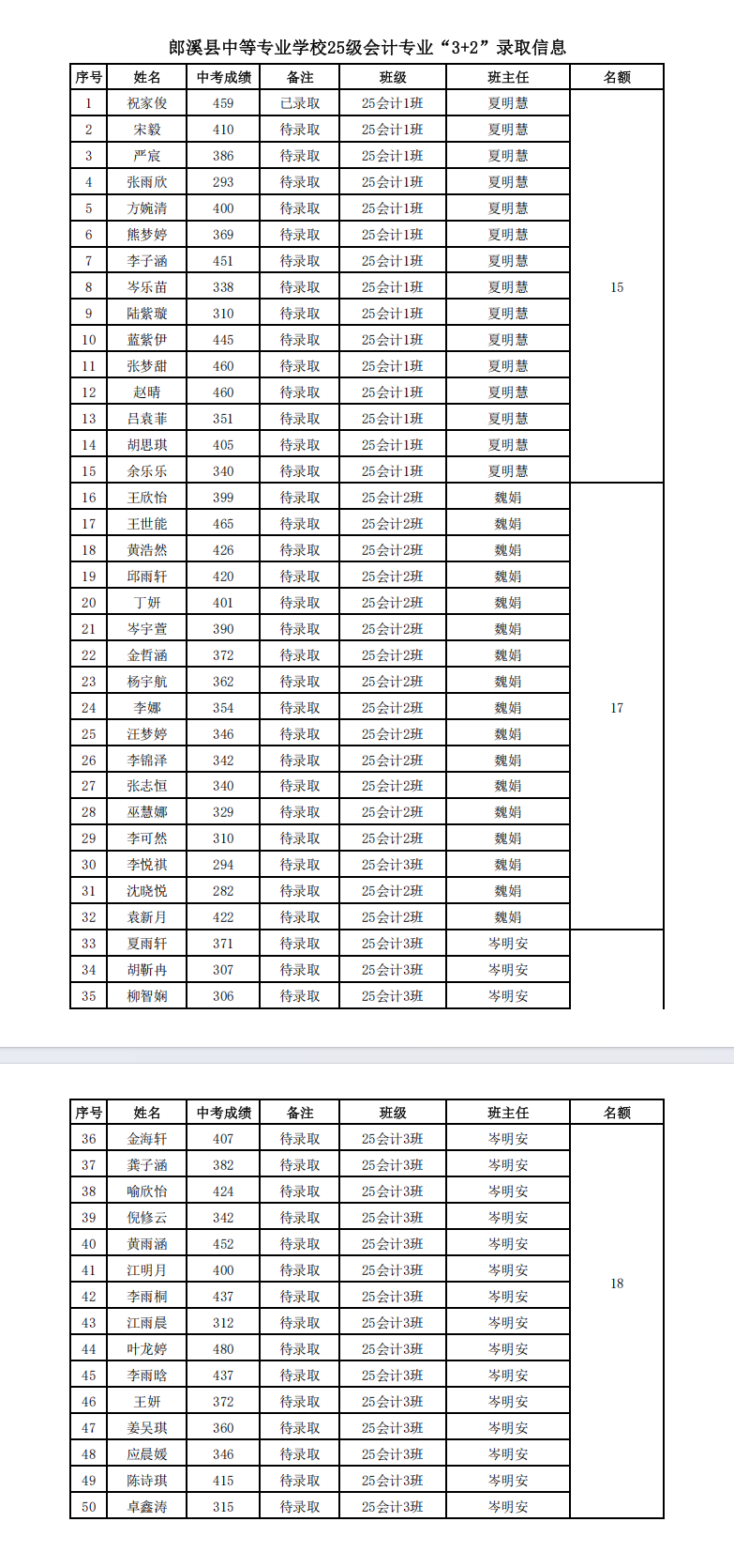郎溪县中等专业学校25级“3+2”学籍录取学生信息统计表
