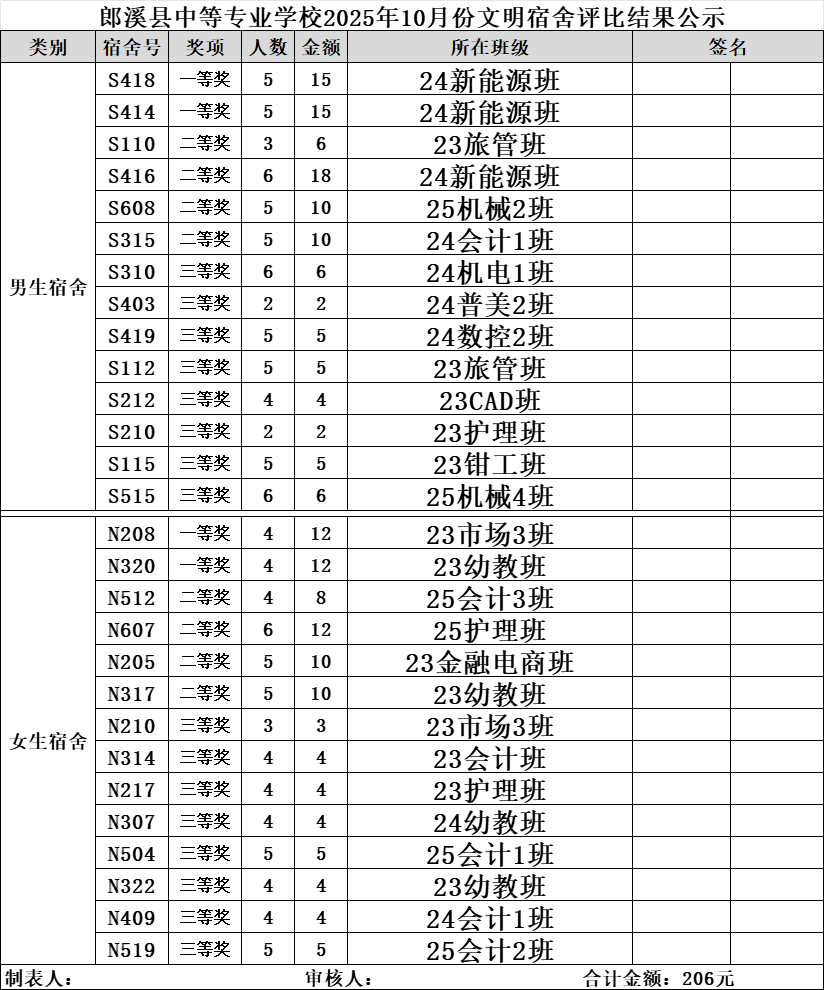 2025-2026学年第一学期10月份文明班级、宿舍评比