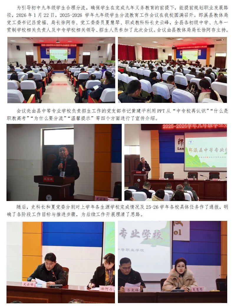 郎溪县25-26学年九年级分流教育工作会议在郎溪中专校召开
