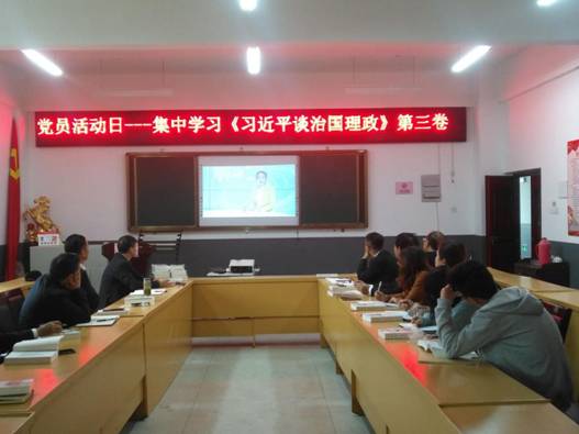10月27日,郎溪县中等专业学校党支部开展党员活动日---集中学习《习近平谈治国理政》第三卷活动。本次活动由党支部书记易卫同志主持,全体党员积极参加。